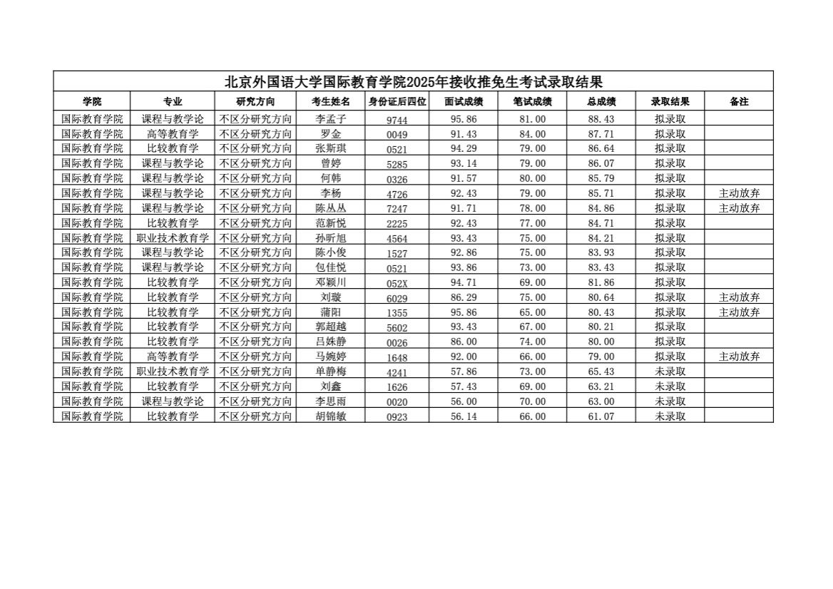 北京外国语大学国际太阳成集团tyc7111cc2025年接收推免生考试录取结果