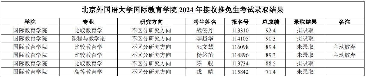 北京外国语大学国际太阳成集团tyc7111cc2024年接收推免生考试录取结果公示.xlsx