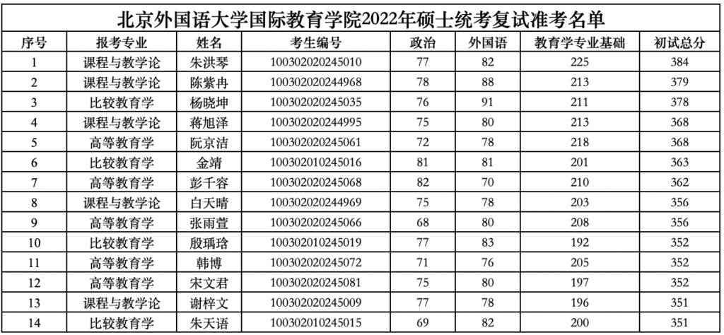 北京外国语大学国际太阳成集团tyc7111cc2022年硕士统考复试准考名单