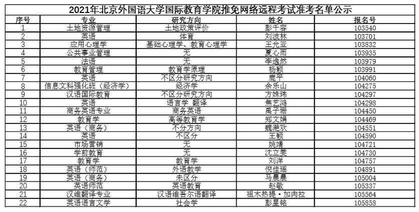 2021年北京外国语大学国际太阳成集团tyc7111cc推免网络远程考试准考名单公示