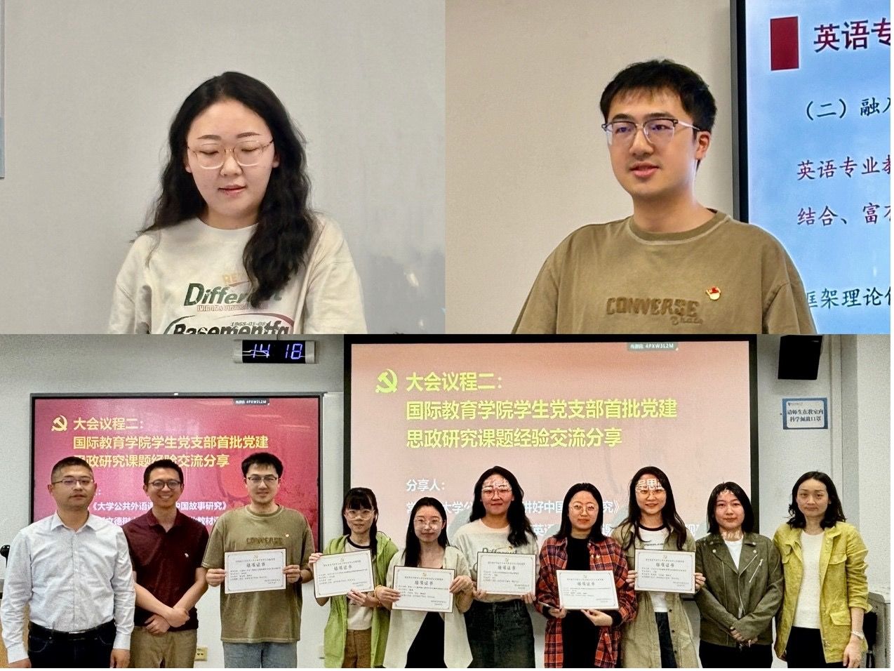 随后,参会师生围绕学生党支部首批党建思政研究课题进行了结项学习交流。课题负责人代表常畅、张逸帆分别以“大学英语课讲好中国故事研究”和“立德树人导向下英语专业教材任务思政育人功能研究”为主题进行了经验交流分享。与会教师代表祝军、柴方圆、王丹、巫锐为项目负责人颁发结项证书,并合影留念。大会通报了学生党建课题今后的组织方式和开展计划。