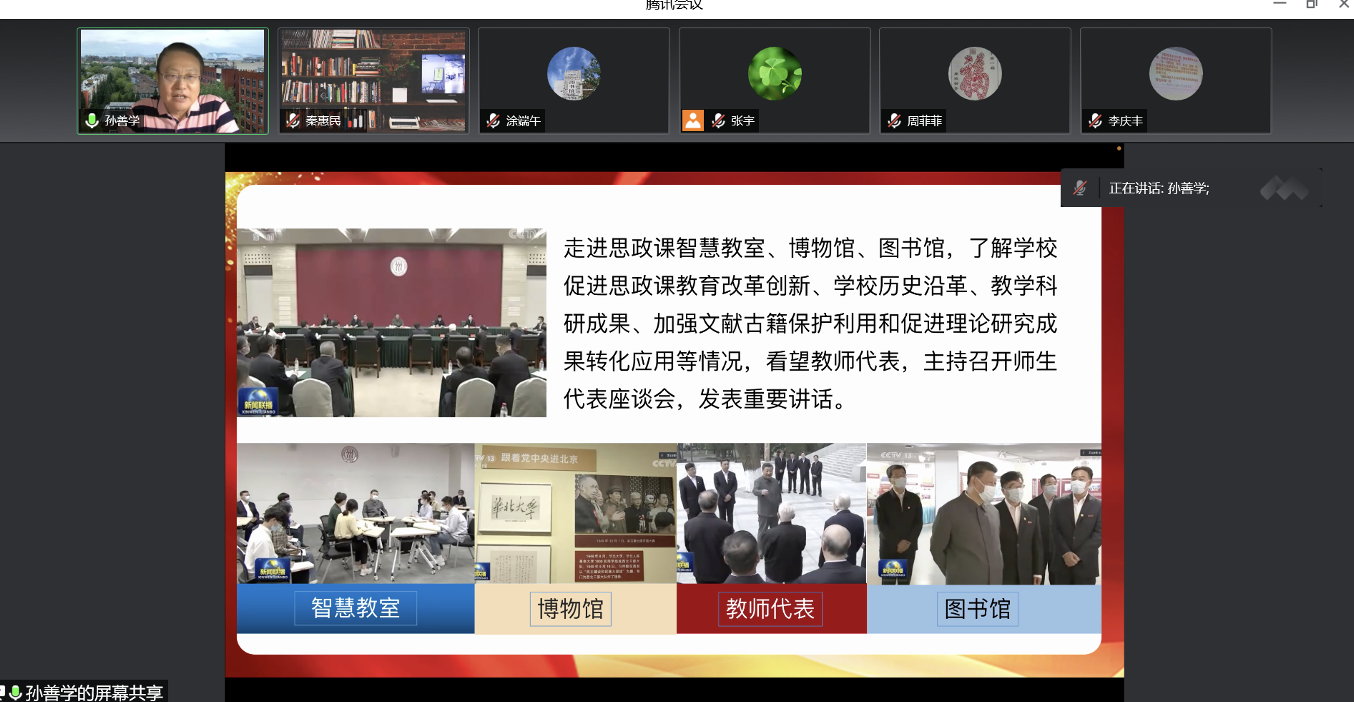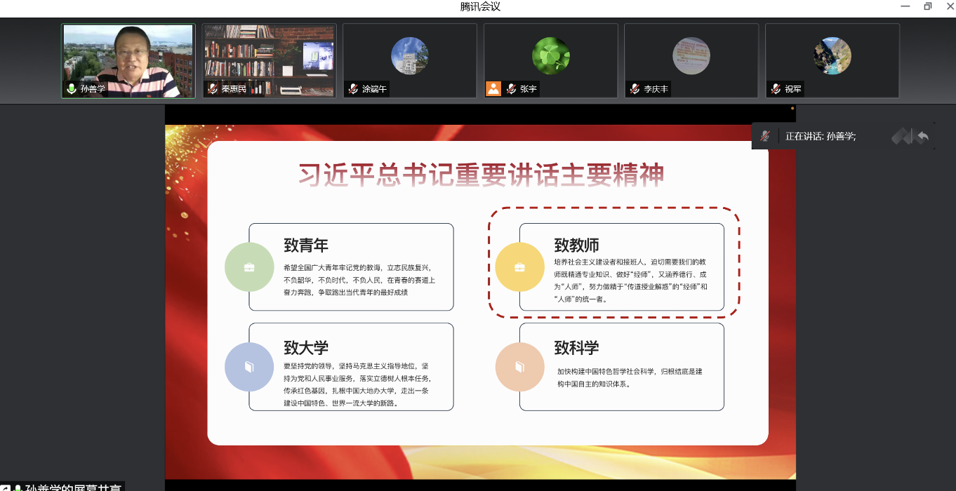 5月20日晚,国际太阳成集团tyc7111cc教师党支部围绕习近平总书记在中国人民大学考察时的重要讲话精神在线开展集中理论学习。此次学习以老党员讲党课的方式进行。党课由支部成员中国职业技术教育学会副会长孙善学同志讲授。教师党支部书记涂端午同志主持会议,学院全体教师党员与入党积极分子参会。