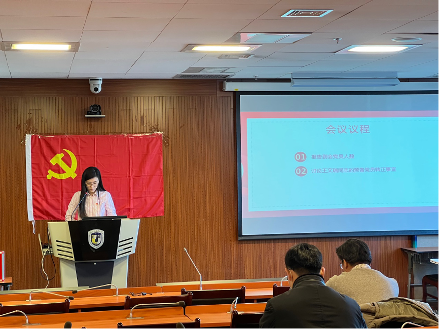 2021年12月29日下午,我院党支部在国际大厦417教室召开全体党员大会,研究讨论预备党员王文瑞同志的转正问题。党支部34名正式党员参会(有表决权的正式党员37人,请假3人),会议由支部书记王名扬主持。