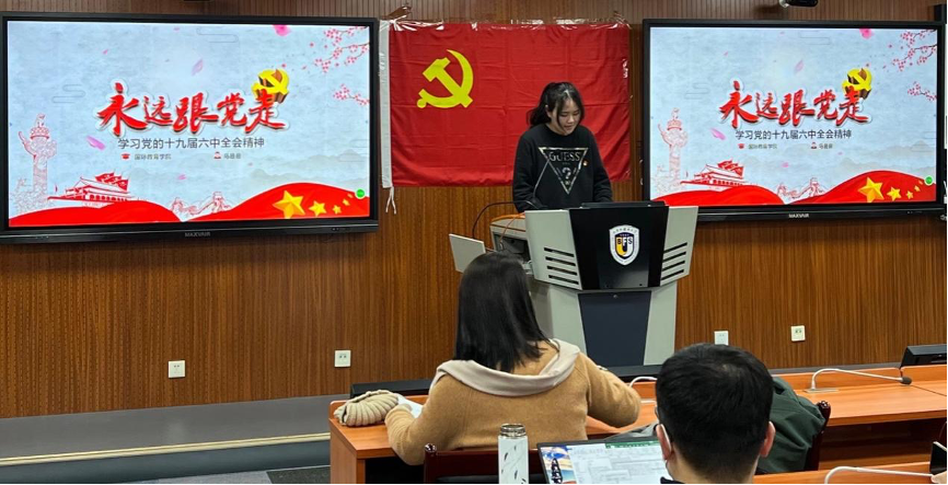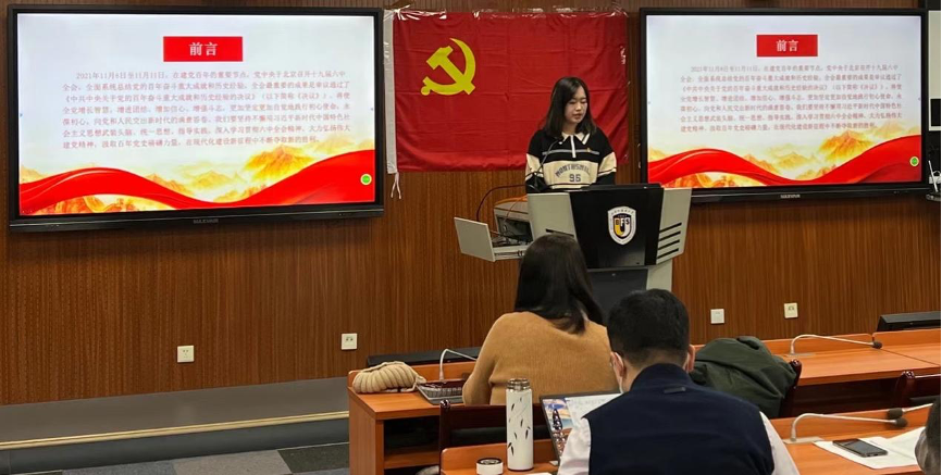 为深入学习贯彻党的十九届六中全会精神,11月24日下午,国际太阳成集团tyc7111cc党支部于国际大厦317教室组织开展以“学习贯彻党的十九届六中全会精神”为主题的集中理论学习活动。党支部书记王名扬同志主持会议,全体党员师生参会。