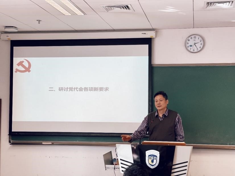 党支部书记王名扬同志主持活动。王名扬同志首先介绍了学校第十次党代会的召开背景和大会主题,带领全体党员同志系统全面地学习了党委书记王定华同志代表中国共产党北京外国语大学第九届委员会所作的《加强党的全面领导 秉承外特精通理念 平稳较快高质量推进世界一流外国语大学建设》报告,并带领大家准确把握五个方面的办学经验,认清面临机遇挑战,明确未来五年及未来十五年北外改革发展的奋斗目标,深刻领会建设“六个北外”的重大部署。