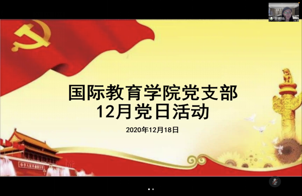 2020年12月18日上午,我院党支部在线开展以“回望2020”为主题的党日活动。首先,党支部书记王名扬就2020年秋季学期支部党务工作向全体党员做汇报,包括党员政治生活、定期理论学习、党员发展以及下一阶段的工作安排等方面。接下来,每位与会党员同志结合自身经历,对本年度的工作、学习和生活进行回顾和总结。发言中,与会同志还就新冠疫情对世界、社会、教育以及自身的影响进行了交流和讨论。