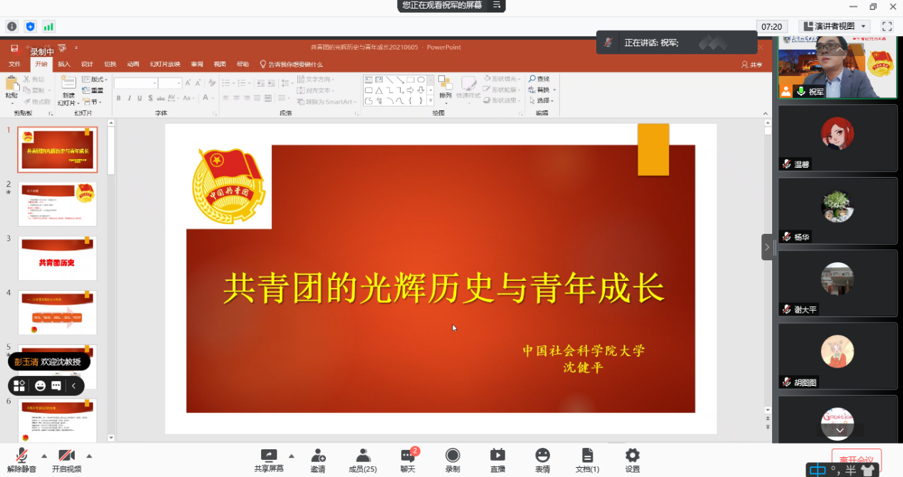 学院研究生成长论坛暨首期团史学习活动于6月5日顺利举行。本次讲座以在线学习的形式召开,中央团校原团委书记、中国社科院大学文学院党总支书记沈健平副教授为学院全体团员学生作了“共青团的光辉历史与青年成长”主题团史讲座,讲座由学院祝军老师主持,学院全体团员和入党积极分子聆听了讲座。