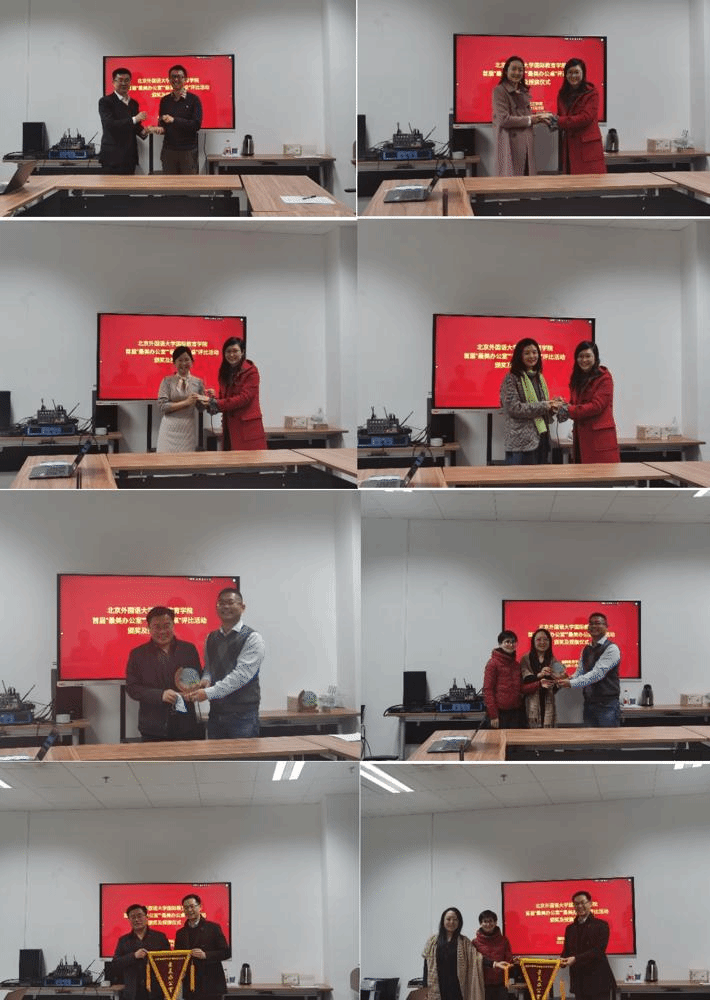塑造美好环境,共建美好学院。为了引导全体教职工营造良好的工作环境,提升教职工的工作热情,彰显教职工的精神面貌,我院工会于10-11月举办首届“最美办公室”“最美办公桌”主题评比活动,得到教师们的积极响应和参与。经过综合评价和民主讨论,我院最终评选出“最美办公室”2 间、“最美办公桌” 3 个、“最佳创意奖”1个。在此基础上,我院推荐967 教师工作室参与我校首届“最美办公室”评选,获得北京外国语大学“最美办公室”荣誉。11月初,学院举行首届“最美办公室”“最美办公桌”评选活动的颁奖与授旗仪式。苑大勇副院长、王名扬副院长、祝军副书记为获奖教师颁发奖杯,学院工会主席李明为“最美办公室”获得者授予流动锦旗。