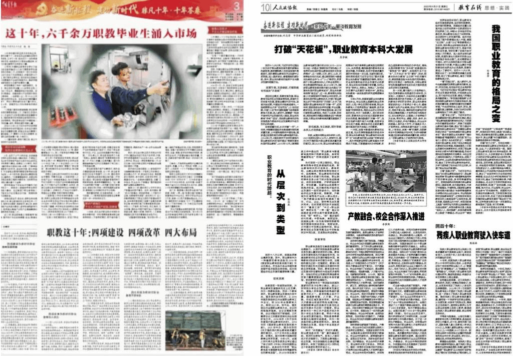 党的二十大召开前夕,《人民政协报》《中国青年报》同日于2022年9月21日分别刊登了中国职业技术教育学会副会长、我院孙善学教授的两篇文章。这两篇文章分别题为“我国职业教育的格局之变”和“职教这十年:四项建设 四项改革 四大布局”。这两篇文章分别以职业教育的十年巨变为主题,对党的十八大以来我国职业教育的发展成就和改革特点进行了系统总结和分析阐述。