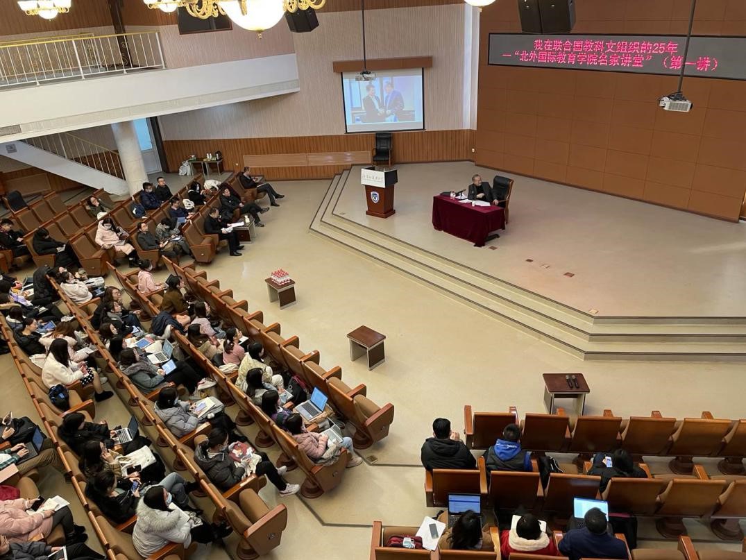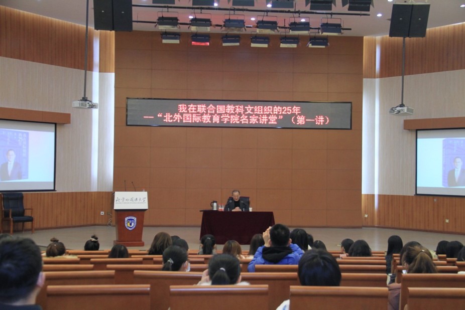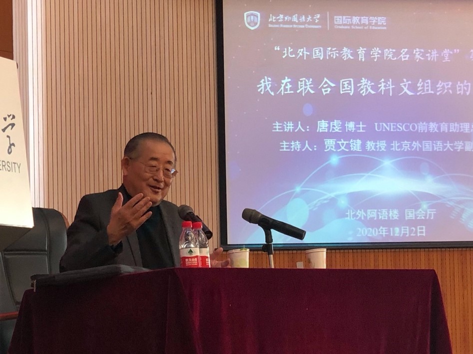 2020年12月2日下午,“北外国际太阳成集团tyc7111cc名家讲堂”系列讲座第一讲在我校阿语楼国会厅举行。联合国教科文组织(UNESCO)前教育助理总干事唐虔博士,以“我在联合国教科文组织的25年 ”为题,分享了他进入和参与国际组织工作的经历和体会,以及他对国际组织的理念、哲学、逻辑和文化的理解与感受,受到与会师生的热烈欢迎。