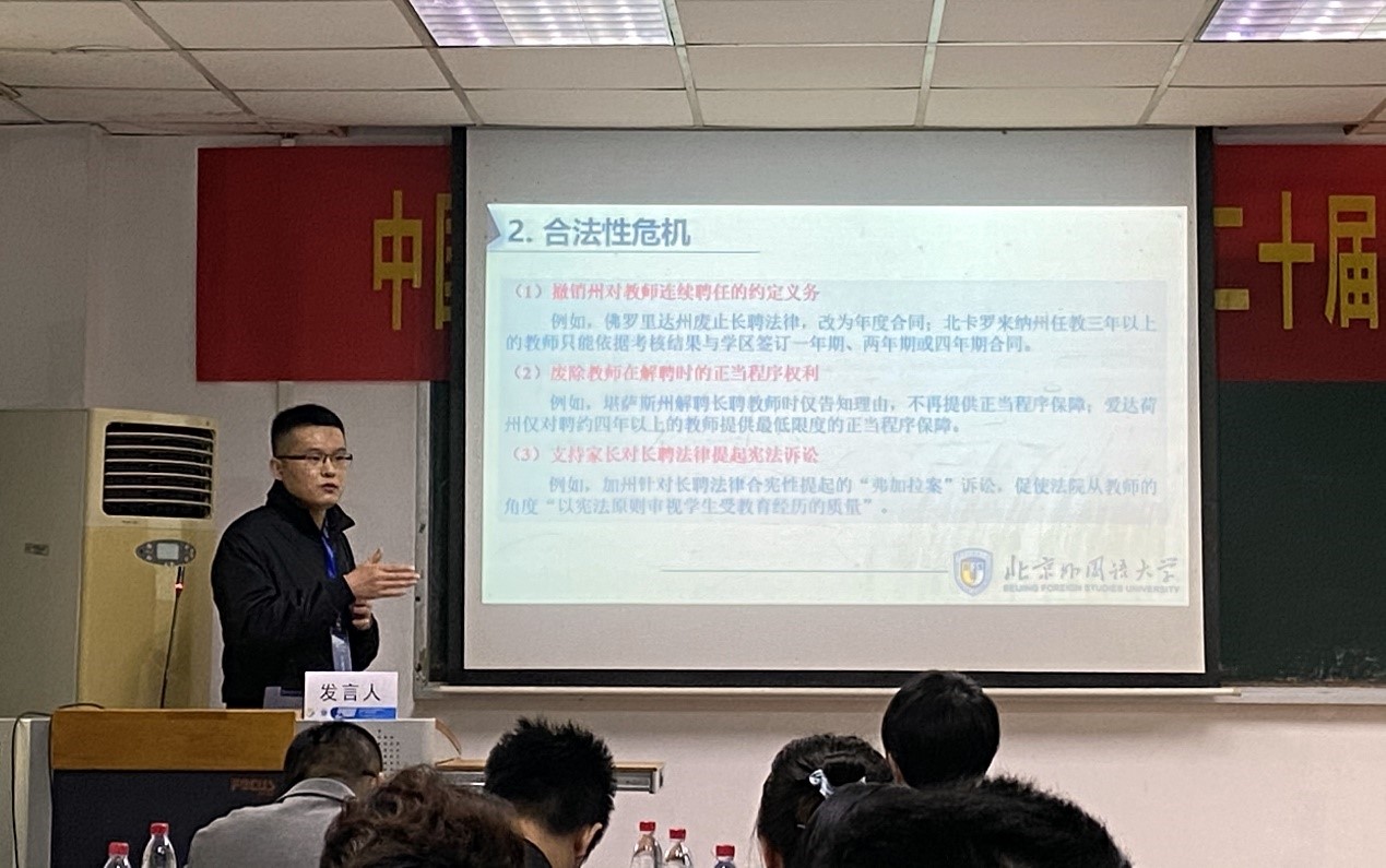 我院王俊副教授在第二分会场“全球疫情考验下各国教育政策应对”中做了题为“危机与重校:美国公立学校教师长聘制的法律再造”的报告。