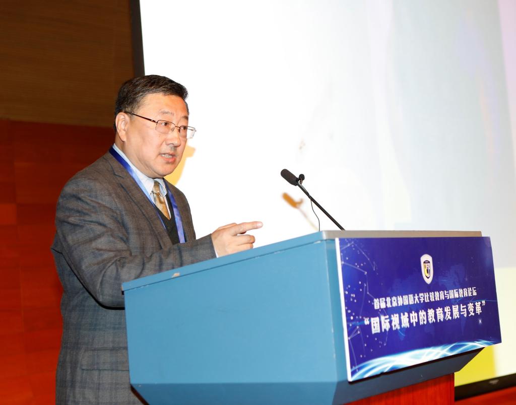 嘉宾演讲结束后,北京外国语大学贾德忠副校长致闭幕词。他说,本次论坛邀请了比较教育专家和教育研究多领域的专家,从不同的领域和学科专业视角进行国际比较,拓展了比较教育的研究视域。围绕论坛主题,各位专家、学者从不同的学科视角做了精彩的演讲,深入探讨全球化背景下,各国各地区教育所面对的各方面问题及挑战,对国际经验和中国实践进行多维度深入研究比较,既有结合新时代的发展需求,探讨了比较教育研究的重要使命与创新实践,又有结合教育的未来发展趋势,呈现教育各领域发展变革的国际前瞻。既探讨了国际视域下的本科教育改革、职业教育发展和教育法治建设等重要议题,又从中国特色和中国道路出发,分析了科技创新与教育改革的关系,反思了国际学校的建设历程。此外,还着眼于国家“一带一路”倡议的重大发展战略,总结了我国教育国际交流的成效与问题,探讨了“一带一路”国家文化教育研究的前沿问题。各位与会专家学者的发言,分享了他们多方面的最新研究成果,拓展和深化了比较教育和国际教育研究的思想碰撞和学术交流。不仅体现了新时代背景下我国比较教育研究的新思考,而且对比较教育的使命和挑战做出了积极回应,研讨了具有长期性、战略性的重大前沿问题,表现了比较教育发展的时代性、学科性和系统性。因此,本次论坛的闭幕并不是结束,而是新发展的一次新的起步。未来,中国将以更加积极的姿态参与全球教育治理,通过交流沟通、研究借鉴、国际合作、取长补短,既促进国内教育改革与发展,又为国际社会传播中国优秀教育经验,为“构建人类命运共同体”贡献中国智慧与中国力量。为实现这个美好愿景,比较教育需要承担相应使命,比较教育学者应为此不懈努力。最后,他祝愿比较教育研究和国际教育蓬勃发展,也期盼与各兄弟院校及学术组织在比较教育研究和国际教育发展中加强合作,携手推进比较教育与国际教育的未来发展。