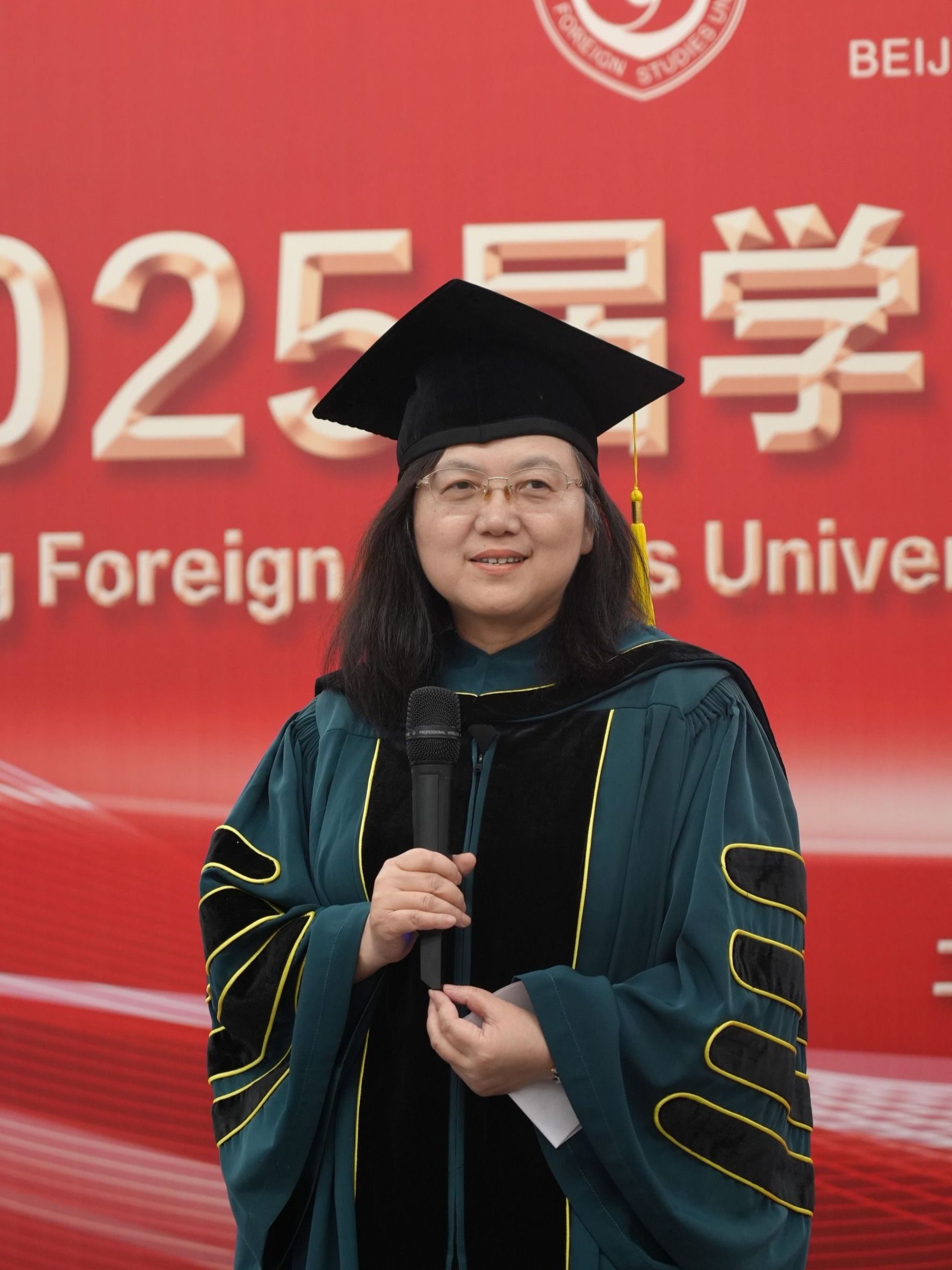 李莉文教授以英文发表致辞,向获得学位的各位同学表示祝贺,希望毕业生在今后的工作、研究、生活中传承和弘扬北外基因,开拓进取、持续创新,书写人生的崭新篇章。